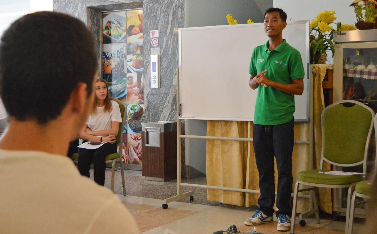 Din introduktion starter med en kort præsentation af Cambodjas historie, efterfulgt af en lektion i Khmer sprog og kultur på kontoret. Her lærer du nogle basale gloser og ord på Khmer, samt hvordan man er respektfuld over for den lokale kultur. Du får også en introduktionspakke med al den information, du skal bruge, inklusiv et kort over byen med de vigtigste steder afmærket.